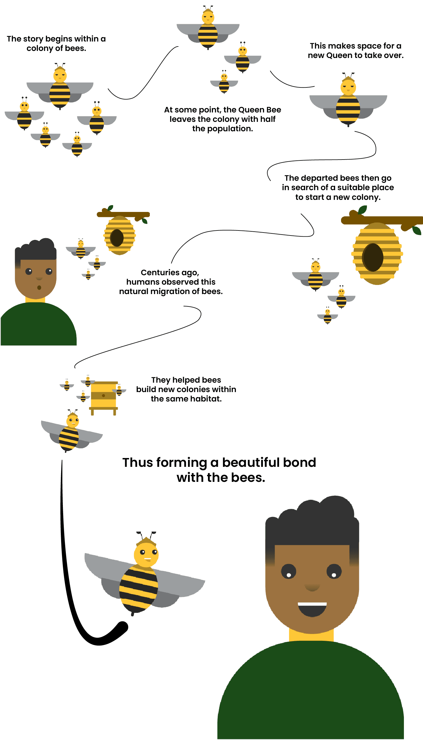 We designed a scrolling, vertical illustration piece to tell the story of how bees and humans have helped each other and coexisted with illustrations made in Bauhaus style using basic shapes.